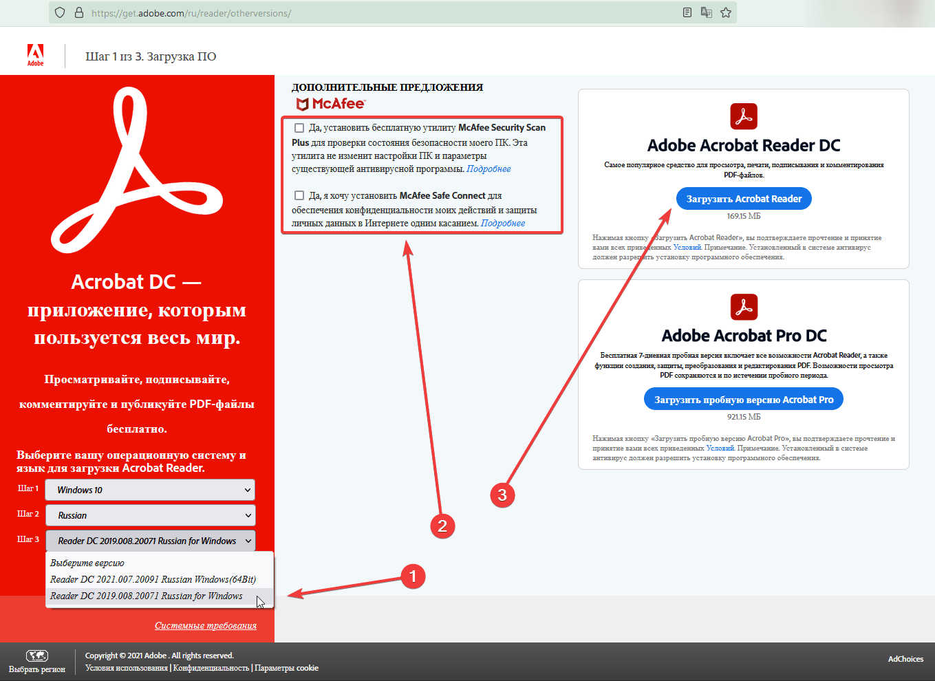 - Страница выбора версии и загрузки: https://get.adobe.com/ru/reader/otherversions/