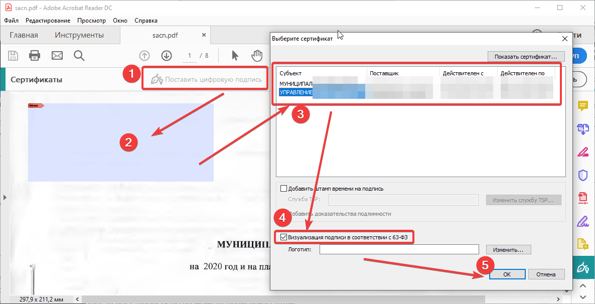 - В появившемся окне выбрать нужный сертификат (шаг 3). Обязательно убедиться, что пункт Визуализация подписи в соответствии с 63-ФЗ отмечен галочкой (шаг 4).